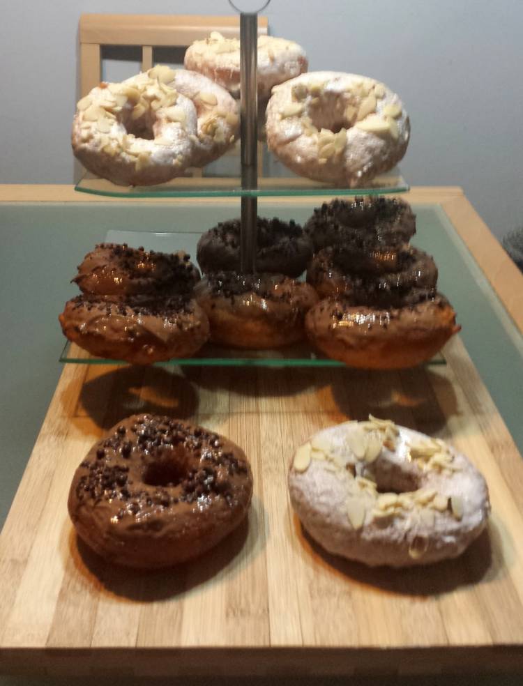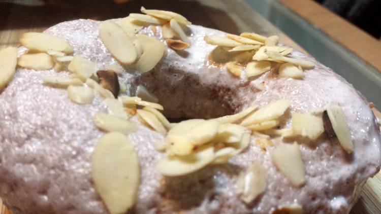 Vamos cojiendo la mitad de los donuts y los vamos pasando por el glaseado de azucar dos veces cada donuts, le damos un golpe de horno a unos 160ºc unos 2 minutos para que la clara se haga y espolvoreamos unas almendras tostadas por encima.
