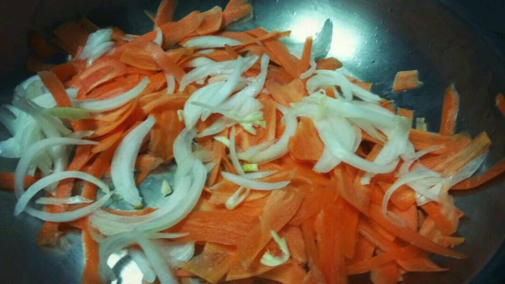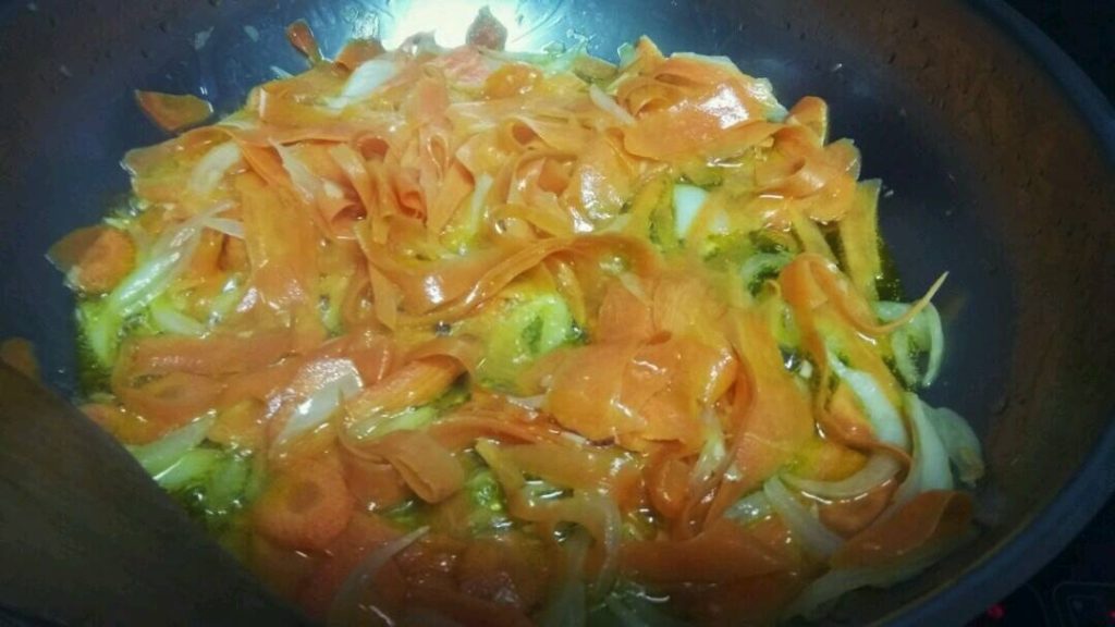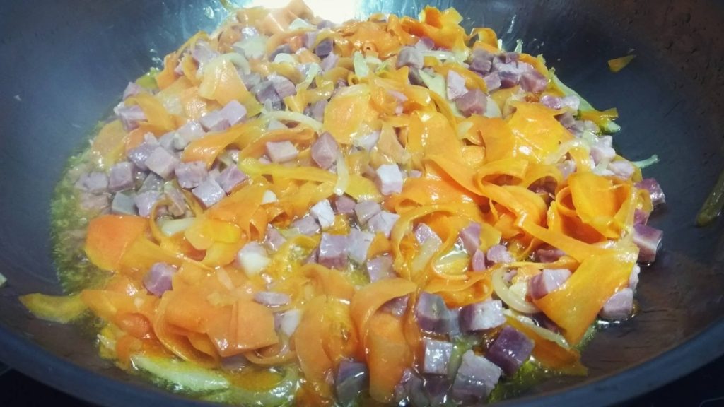 Mientras, cortamos las dos zanahorias, el ajo y la cebolla y lo doramos en una cazuela estilo paellera. Añadimos el jamón y rehogamos todo.