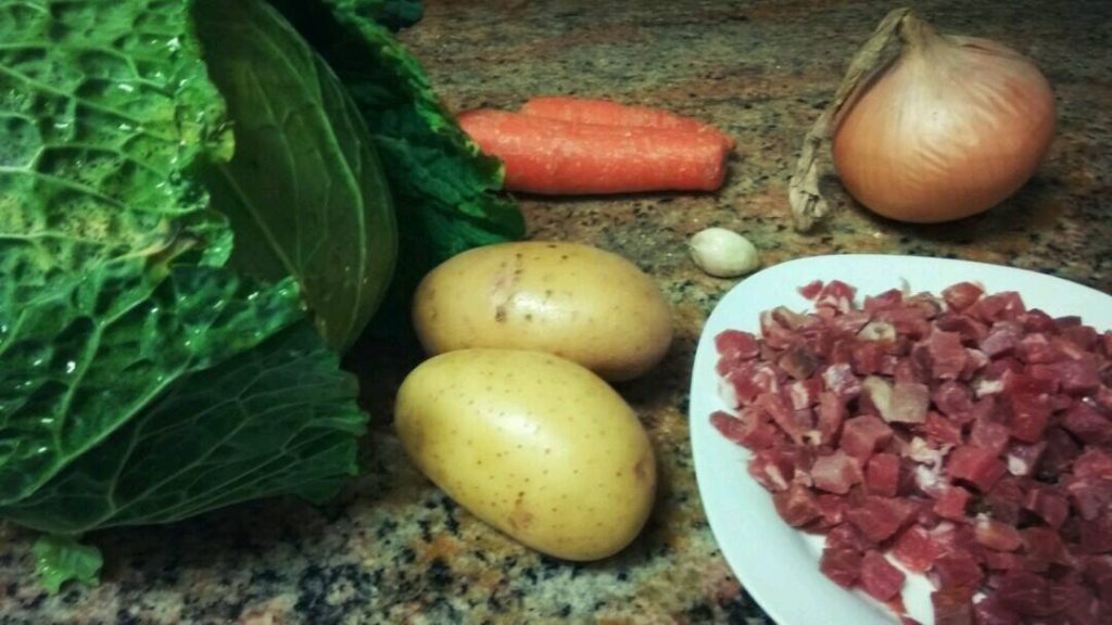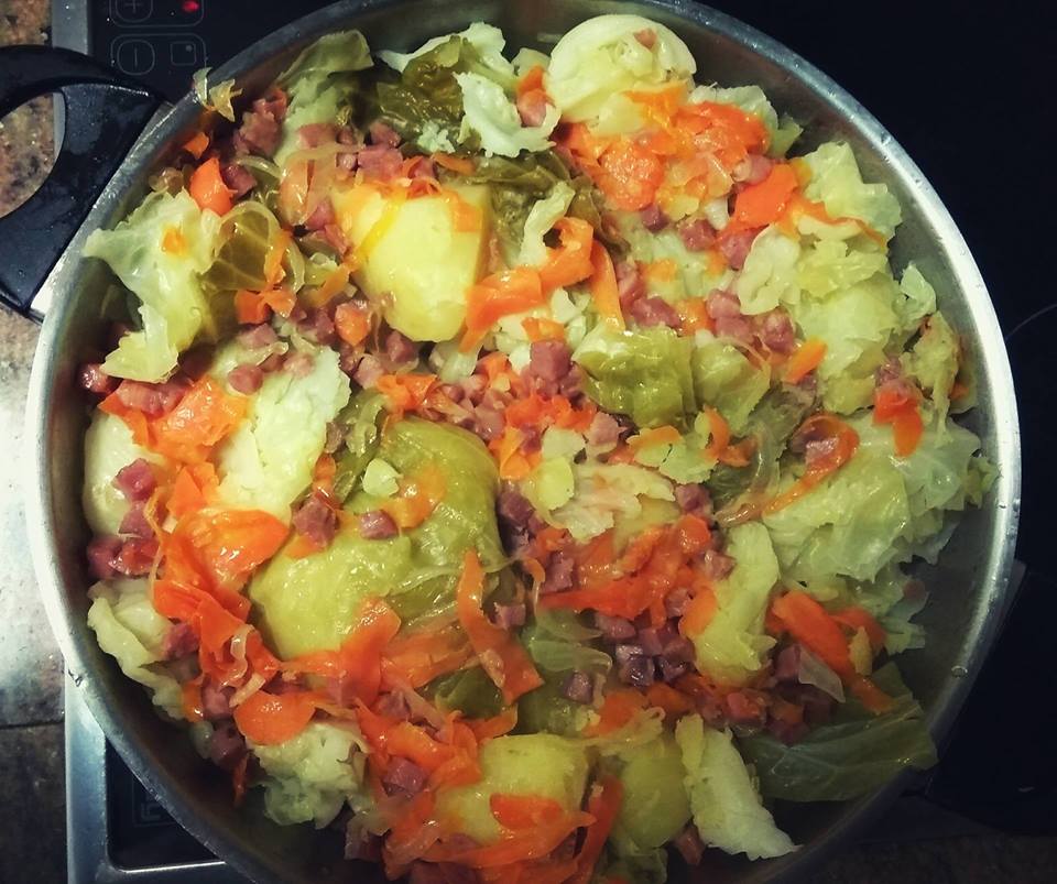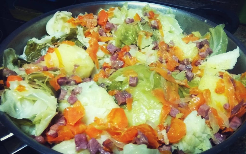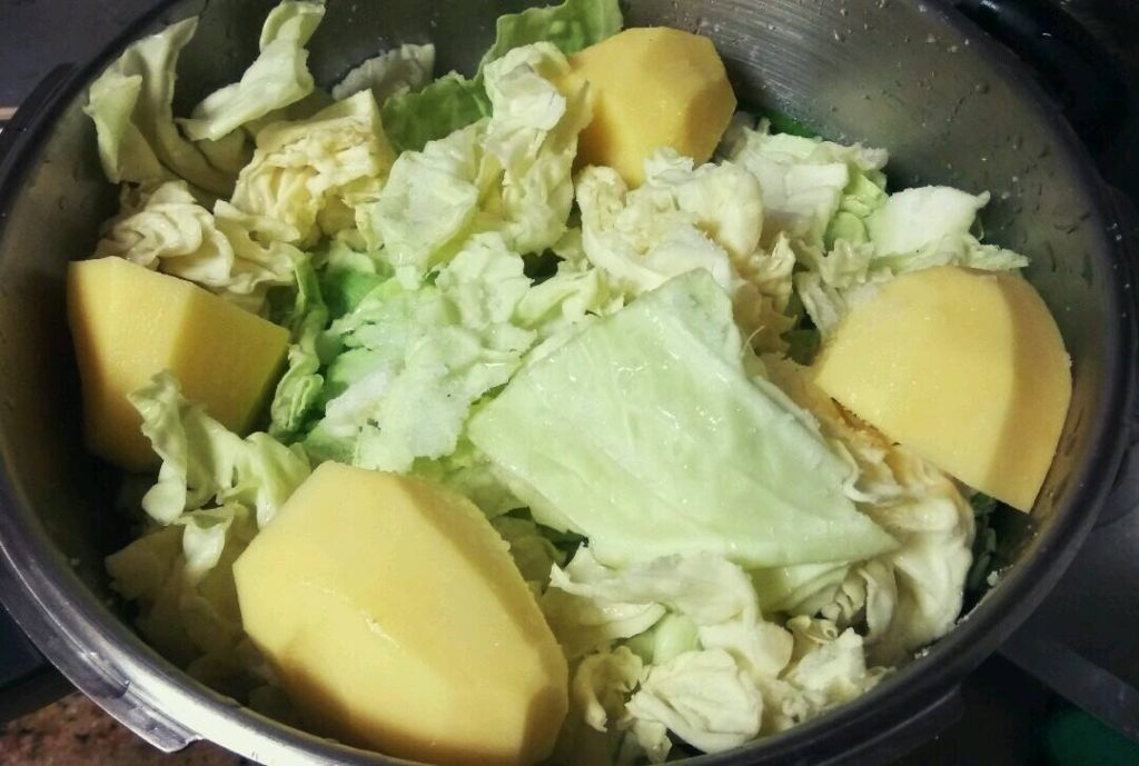 Limpiamos y deshojamos el repollo. Lo metemos en olla a presión con las patatas peladas, y ponemos agua sin que cubra todo y con un puñado de sal. Cuando empiece a echar el vapor bajamos el fuego que estaba al máximo a la mitad y dejamos que se cueza 6 minutos. Se escurre y reserva.