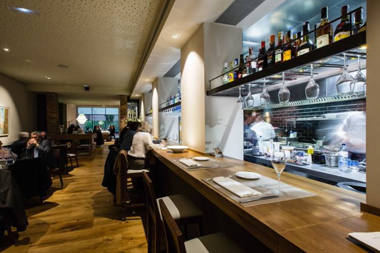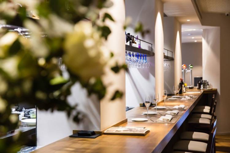 Para los que quieren algo más informal o tienen algo de más prisa, la larga y amplia barra de DOP, con excepcionales vistas a la cocina. Es uno de los rincones más apreciados del restaurante, donde gourmets con poco tiempo o con mucha curiosidad calman su hambre, en ambos sentidos.
