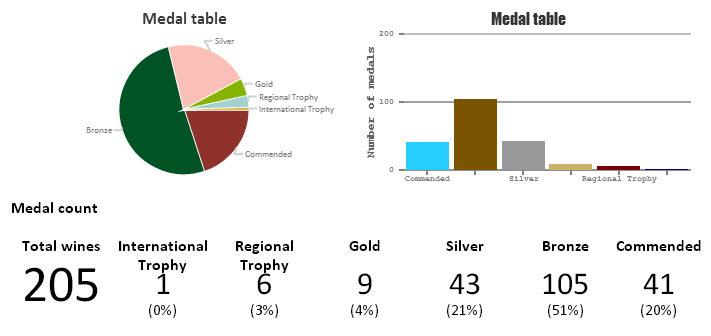 Este año, se otorgaron un total de 2227 medallas, donde 61 fueron Oro, 509 Plata, 1095 Bronce y 517 con Distinción (vino recomendado), entre todos los vinos que han asistido a este certamen de vino internacional en ASia, uno de los más importantes.