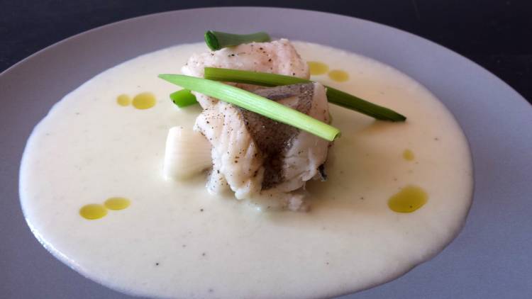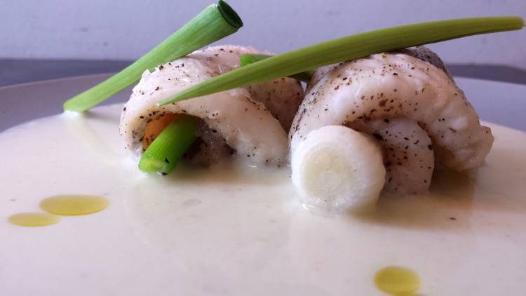 Rollitos de gallo al vapor con vichyssoise y ajetes