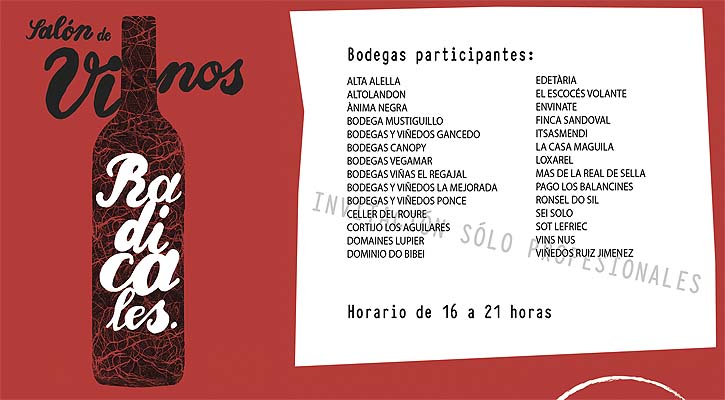 Organizado por el Sindicato del Gusto, se engloban en el concepto de Vinos Radicales a aquellos que elaboran los artesanos del vino más apegados a sus raíces, que trabajan la viña con sus propias manos y se mantienen fieles a las variedades autóctonas y al carácter que transmiten los suelos y el clima, alejándose de los principios comerciales actuales y sus tendencias.