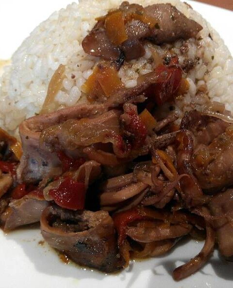 Lo primero es preparar la carne. La limpiamos del exceso de grasa que pudiera tener y se corta en cuadrados de un centímetro más o menos de lado y se sala por encima. Se pican los ajos muy menudos y se echan por encima. Ponemos todo en un bol y echamos el resto: pimienta blanca, perejil muy picado, tomillo, orégano y las cucharadas de pimentón. Se hecha el vino y se revuelve todo. SE tapa con un film y se mete en la nevera un mínimo de 12 horas antes de elaborar la receta.