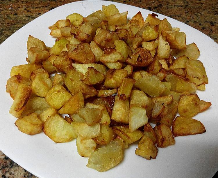 Lo primero que hacemos cuando nos pongamos con la receta es freir las patatas fritas en cuadrados como la carne y los dejamos en el plato como fondo.