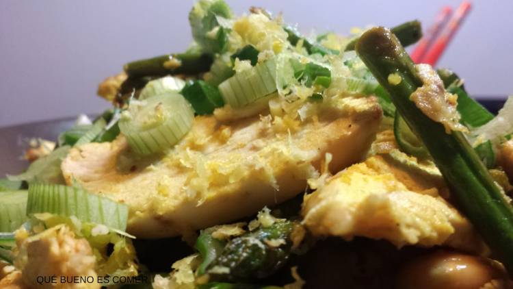 Ponemos 2 cucharadas de aceite de oliva en una sartén a fuego muy caliente, echamos las almendras para tostarlas. Cuando ya estén, añadimos los trigueros que cortaremos en trozos de 2 centímetros y salteamos todo en la sartén. A continuación echamos el pollo que teníamos reservado y, con fuego muy vivo, dejamos que se dore mientras que lo revolvemos para evitar que se nos pegue. Salpimentamos y ponemos la cúrcuma y revolvemos. Echamos el zumo de un limón y unas gotas de salsa de soja.
