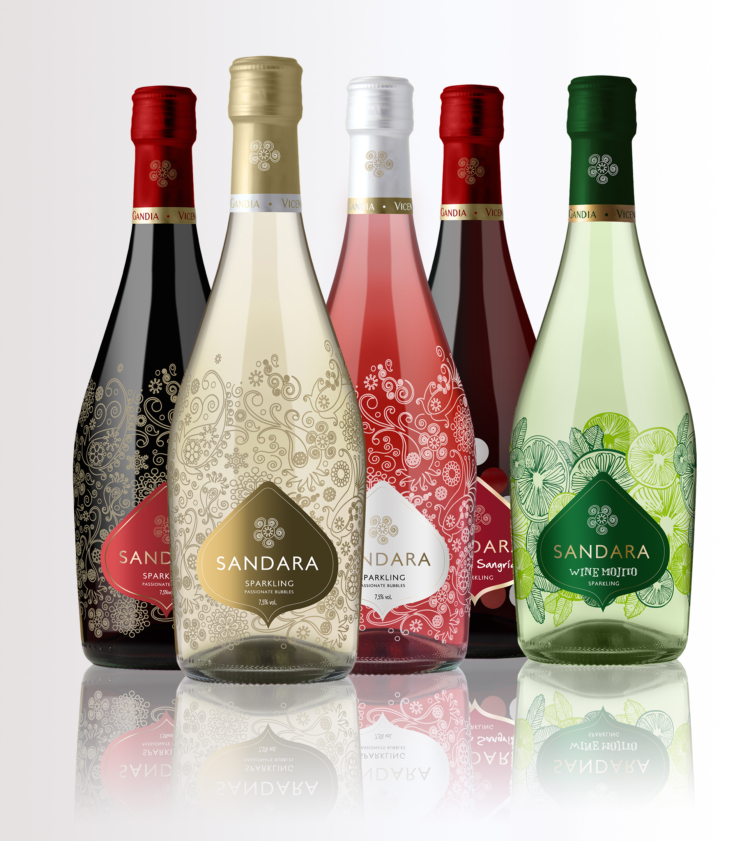 El packaging de Sandara fue concebido por el equipo interno de Marketing de Bodegas Vicente Gandía. Está inspirado en motivos serigrafiados en la propia botella que reflejan perfectamente el estilo joven, alegre, chispeante, divertido y elegante de estos vinos.