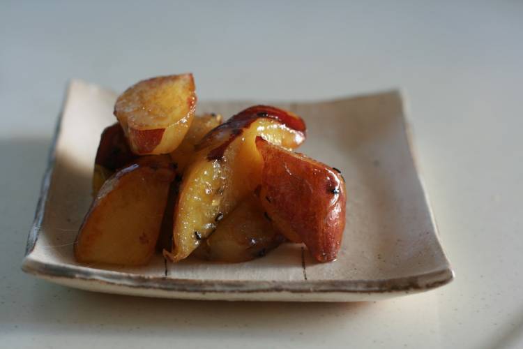 Cogemos una sartén y ponemos un poco de mantequilla y pasamos los trozos de nuestra patata dulce a fuego medio hasta que estén dorados, momento en el que añadimos un poco de miel y mezclamos bien. Finalmente se le añaden semillas de sésamo negro.