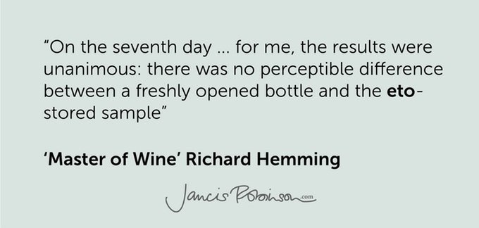 "Después de siete días en Eto no hubo diferencia en el sabor de la botella recién abierta", dijo Tom Harrow, director de vinos de la firma Honest Grapes de Londres.