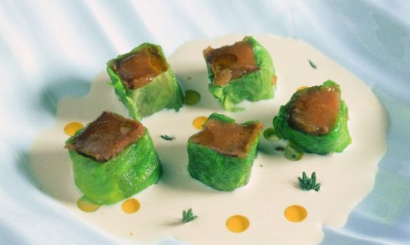 Escalda un minuto las hojas de lechuga en el consomé de carne. Refréscalas en agua con cubitos de hielo para que no pierdan color. Corta las carrilleras en rectángulos y envuélvelas en frío en las hojas de lechuga. Corta los rollitos de la lechuga rellena en trozos regulares y pequeños. Sazónalos por fuera y reserva.
