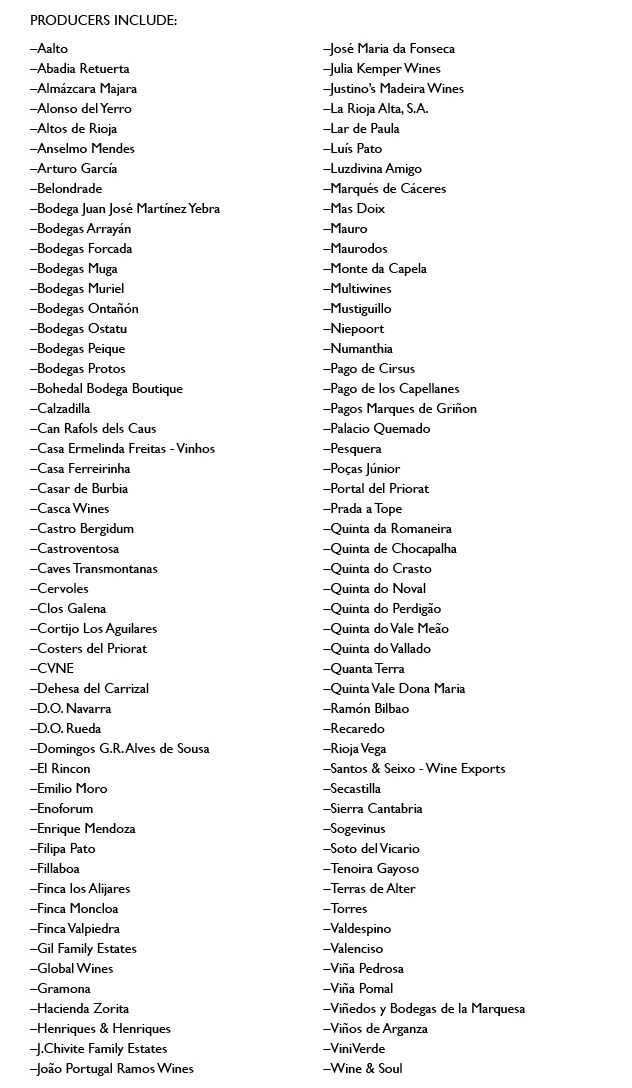 Cerca de 100 míticos p`roductores de vino se darán cita en este evento como CVNE, Gramona, La Rioja Alta, Mauro, Muga, Numanthia (ppor España) o Henriques & Henriques, Justino's o Quinta do Noval (por Portugal).