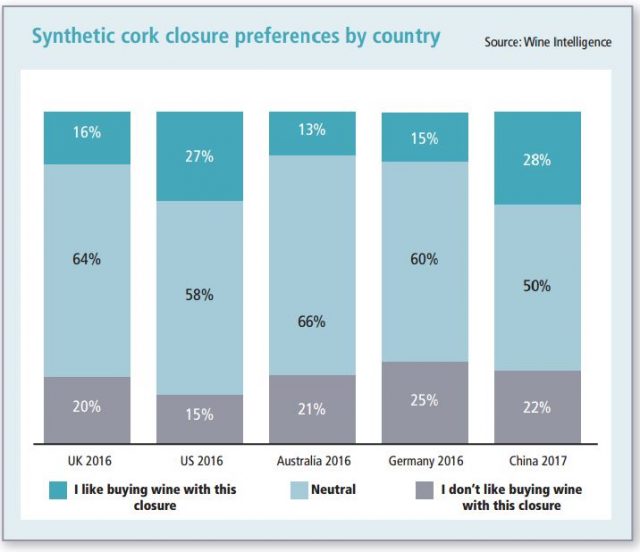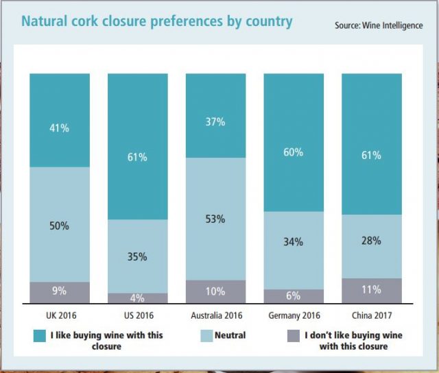 Wine Intelligence informó que China y Estados Unidos fueron los países que más preferían la compra de vino bajo corcho natural, con el 61% de participantes de ambas naciones coincidiendo con la afirmación de que les gustaba comprar vino con tapón de corcho natural . Fueron seguidos de cerca por Alemania, donde el 60% de los encuestados dijeron que disfrutaron de comprar vino bajo corcho natural.