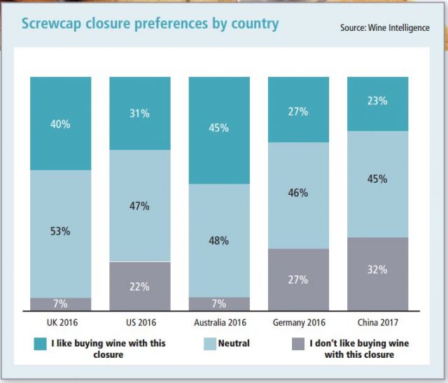 Sin embargo, fue China, una vez más, quien encabezó la lista de los que no comprarían vino con estos cierres, con el 32% no gusta comprar vino con el cierre, seguido por Alemania con 27%, Estados Unidos con 22% y Australia y el Reino Unido ambos con 7 %.