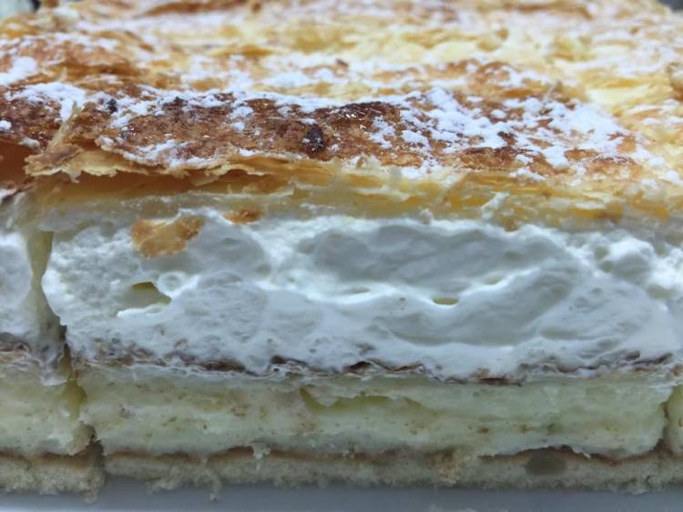 Como podéis ver en el corte, las capas que vamos a hacer son una base de bizcocho, que si tenéis a mano podéis usar sobaos, una capa siguiente de crema pastelera, una capa siguiente fina de hojaldre crujiente, una de nata montada y otra de hojaldre crujiente otra vez, decorada en la parte superior de azúcar glass.