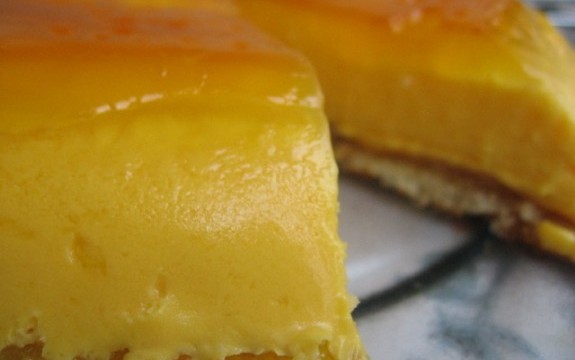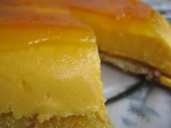 Se baña entonces la tarta con la preparación siguiente: En un cazo se pone el azúcar, el agua fría y el pellizco de vainilla. Se pone a fuego mediano unos 10 minutos, después de los cuales se agrega la cucharada sopera de agua fría. Se da vueltas de prisa hasta que espese y se añade el perfume de naranja. En seguida se baña la tarta con esto y se deja enfriar. Se puede adornar con unas guindas o unos montoncitos de nata hechos con la manga.