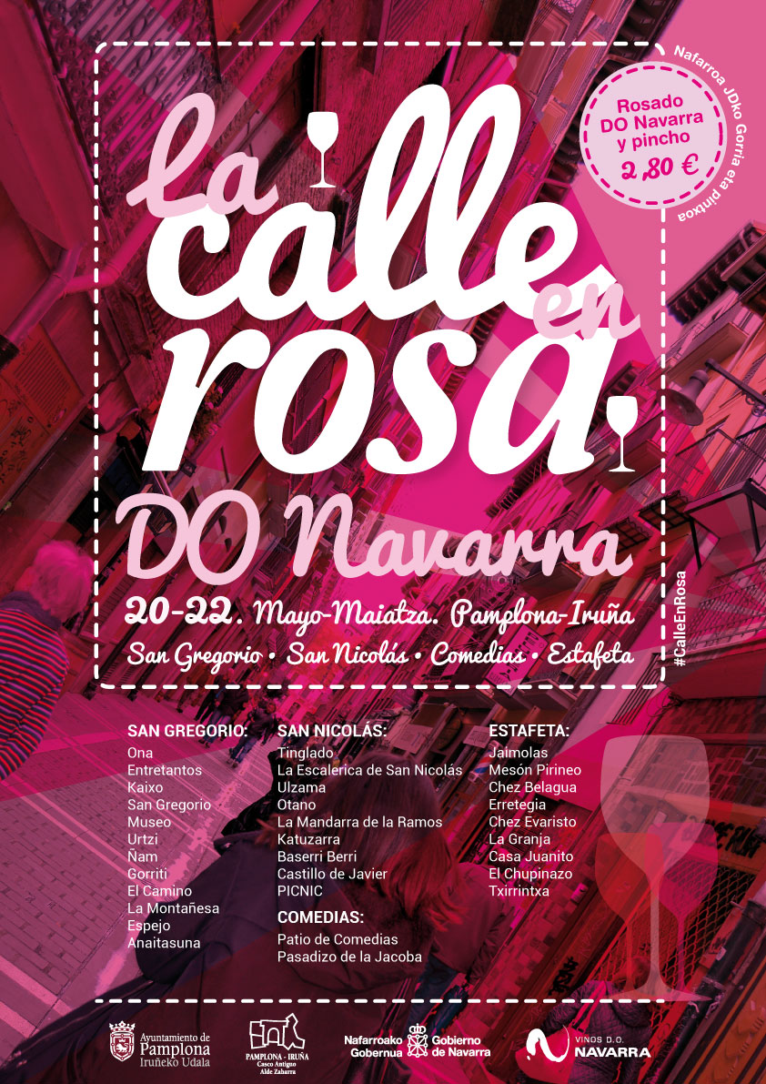 El vino rosado de la Denominación de Origen Navarra vuelve a teñir de color rosa las calles de Pamplona del 20 al 22 de mayo. En esta ocasión, serán las calles San Gregorio y Ciudadela las que se convertirán en “La Calle En Rosa”. Además, hasta 34 bares ubicados en las calles que acogieron las anteriores exitosas ediciones del evento, Estafeta, San Nicolás y Comedias, ofrecerán al público una propuesta de vino rosado Navarra y pincho al precio de 2,80 euros.