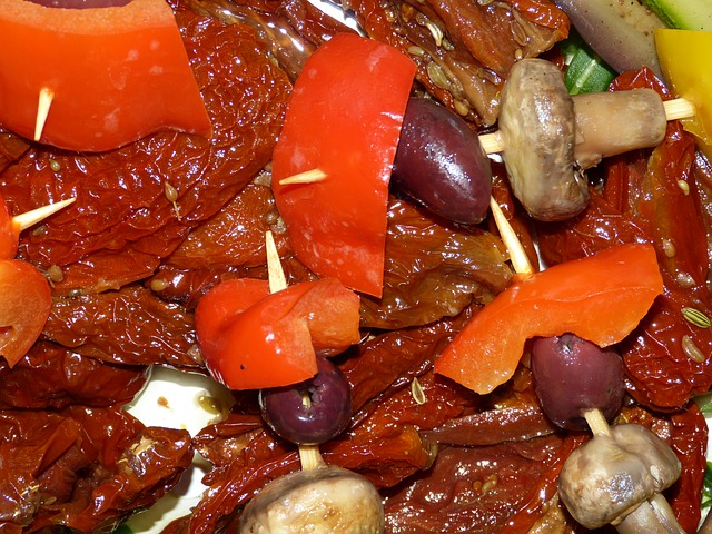 Tomates fritos con brochetas de pimiento aceitunas y champiñones