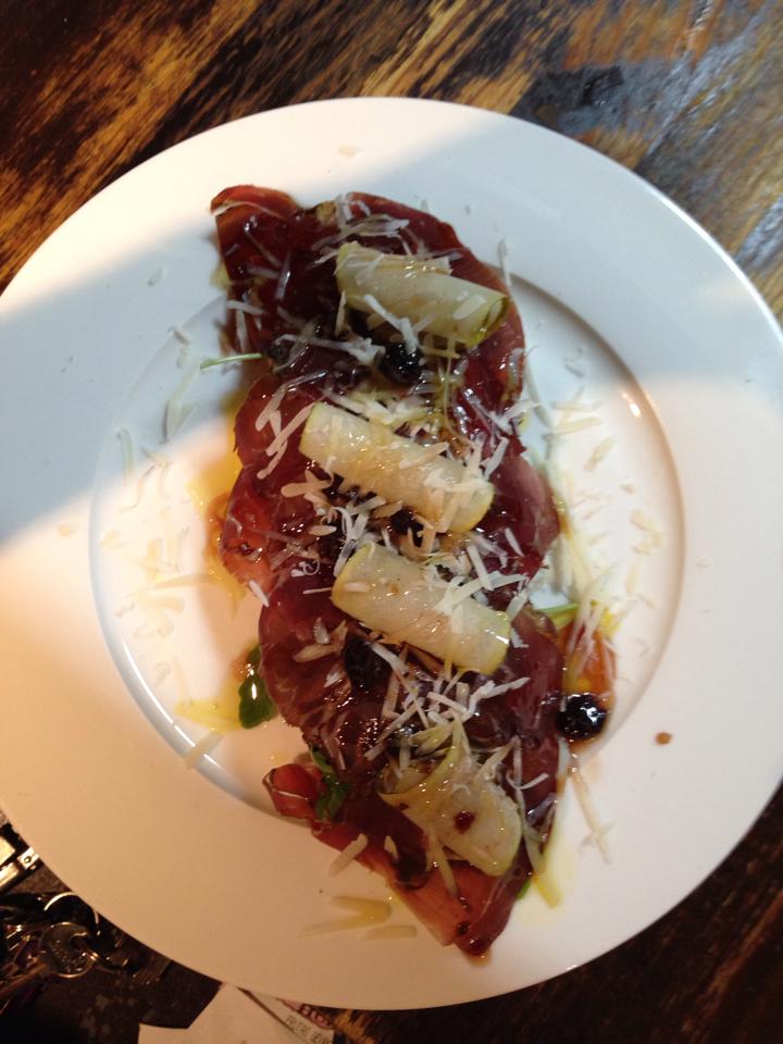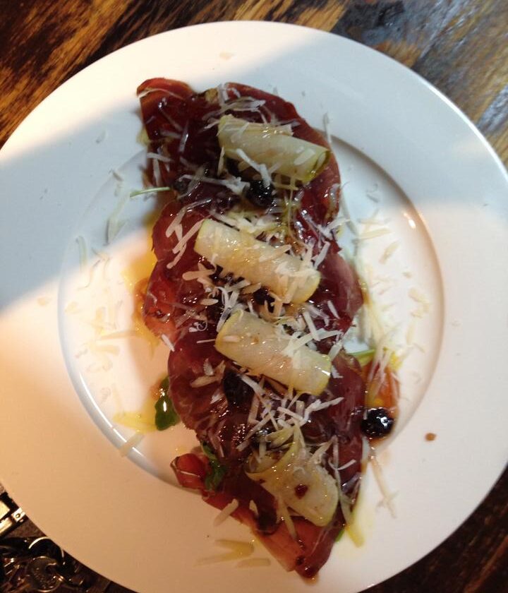 Tosta de cecina con pera y queso parmesano