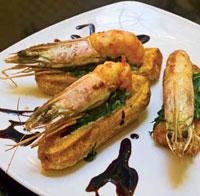 Pasamos al relleno, en nuestro caso los camarones, que los pocharemos en agua con zumo de limón y sal. Una vez cocidos los cortamos en trozos pequeños que formarán parte del relleno a colocar sobre el plátano y tras esto se volverán a pasar por la sartén hasta que estén dorados, sacándose en ese momento y sirviéndose calientes echándoles sal al gusto.