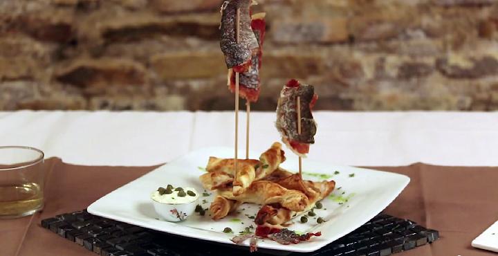 Cortamos las tiras de hojaldre, ponemos encima trocitos de filete de trucha, sazonamos y enrollamos. Hornearemos a 200 grados durante 10 minutos o hasta que estén dorados.