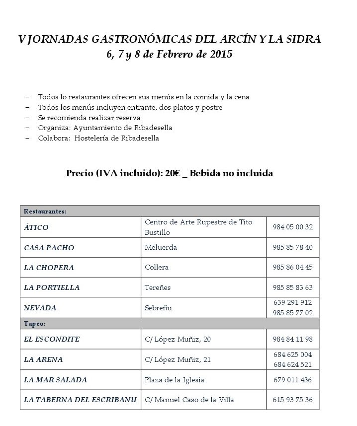 El fin de semana del 6 al 8 de febrero se celebra en el concejo de Ribadesella las V Jornadas Gastronómicas del Arcín y la Sidra en varios restaurantes del concejo. Todos los menús incluyen entrante, dos platos y postre, también ofrecerán sus menús en la comida y en la cena.