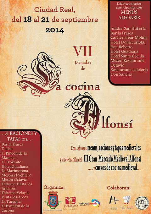 VII Jornadas de Cocina Alfonsí en Ciudad Real que contarán con la participación de 18 restaurantes durante los días que transcurren entre el 18 y el 21 de este mismo mes de septiembre y que estarán organizadas por el ayuntamiento de la localidad y la Asociación Provincial de Hostelería y Turismo.