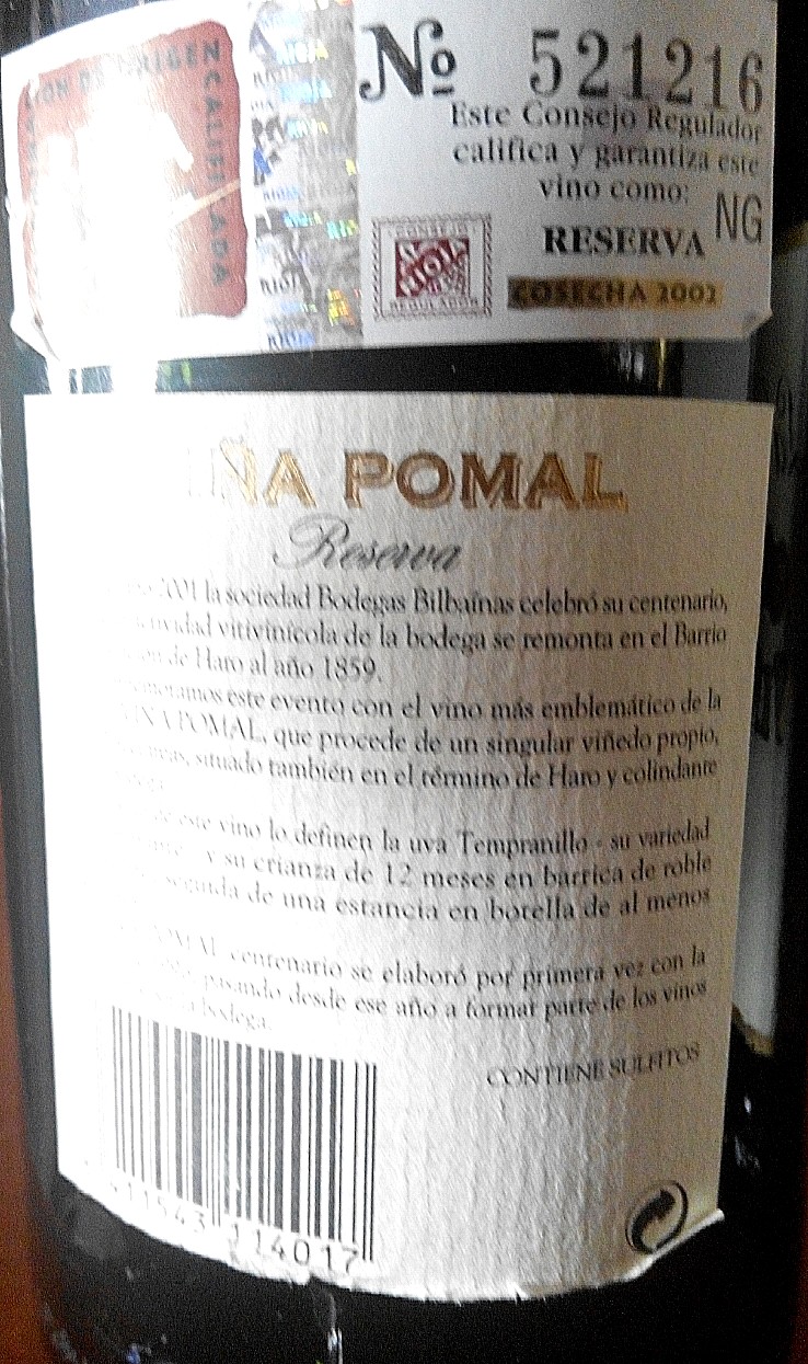 Hoy traemos otro de esos clásicos de La Rioja. Se trata de Viña Pomal Reserva 2002, de Bodegas Bilbainas. Buen vino pero quizás se nos quede un poco corto para lo que esperábamos de un reserva. No obstante es un grandísimo vino.
