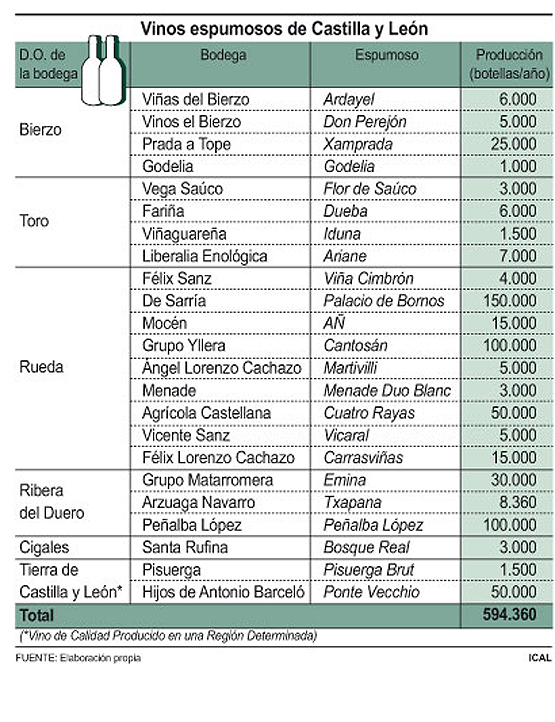 Es con diferencia la denominación de origen Rueda la que lleva la voz cantante en esta comunidad en la producción de vino espumoso de calidad, ya que hablamos de una producción de 347.000 botella, lo que se traduce en un 60% de todos lo vinos espumosos de esta comunidad. Lo que es verdad es que además de la 'pupa' que les hacen a los cavas catalanes otros cavas extraordinarios como son los extremeños, está claro que el vino espumoso está experimentando un auge muy interesante que hará daño a las cifras que maneja el colectivo de cava catalán.