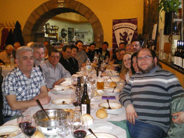 Tras esta agradable visita, y haber “abierto boca”, socios y simpatizantes nos dirigimos al villafranquino “Mesón Don Nacho”, donde degustamos un delicioso menú berciano, caracterizado por el toque de cocina casera que en la zona afama al Mesón. El menú estuvo compuesto de tres entrantes: Lacón con pimientos del Bierzo, cecina con aceite, pote berciano (a base de fréjoles verdes), un plato "de resistencia" a elegir entre cordero asado o bacalao de la casa, y variedad de postres caseros a elegir. Todo ello regado con Vino D.O. Bierzo Luna Beberide.