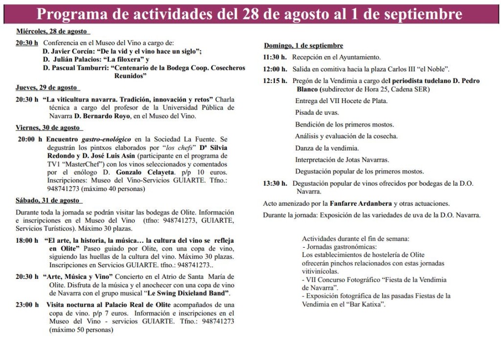 Organizada por la Cofradía del Vino de Navarra nos encontramos con un conjunto de actividades en torno al mundo del vino que van a encantar a cualquiera de los que os dejéis caer por Olite en esos días. El Pregón de la Vendimia correrá a cargo del periodista navarro, Pedro Blanco.
